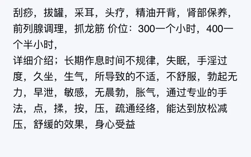 服务项目: 拔龙筋,按摩,推油,拔罐刮痧